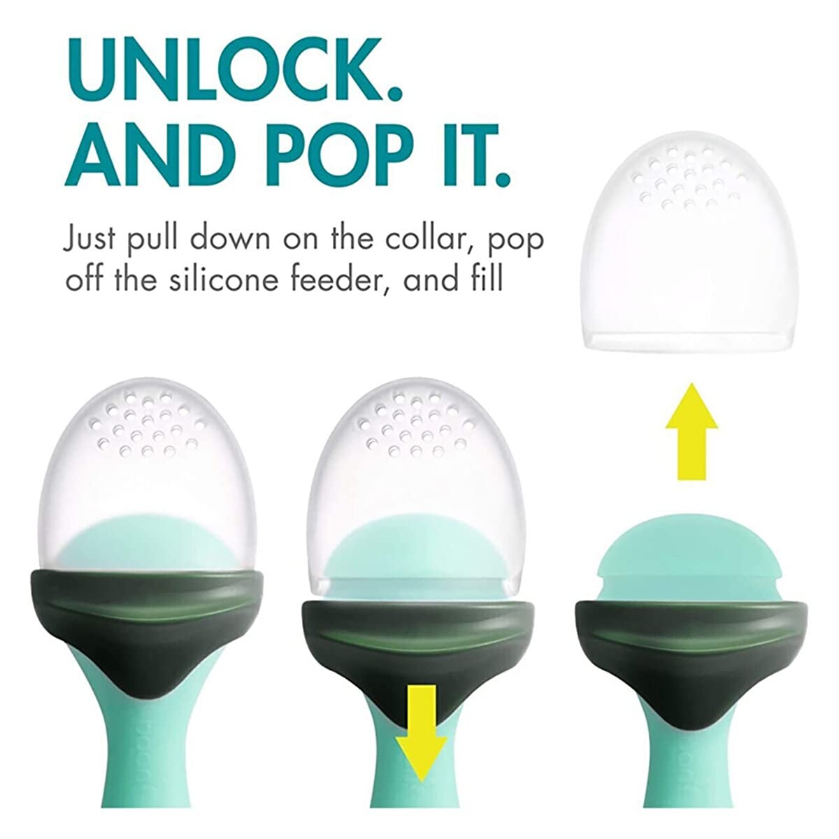 - puha szilikon fedél lehetővé teszi, hogy a baba egyedül ehesse a gyümölcsöket és a zöltségeket a kis lyukakon keresztül