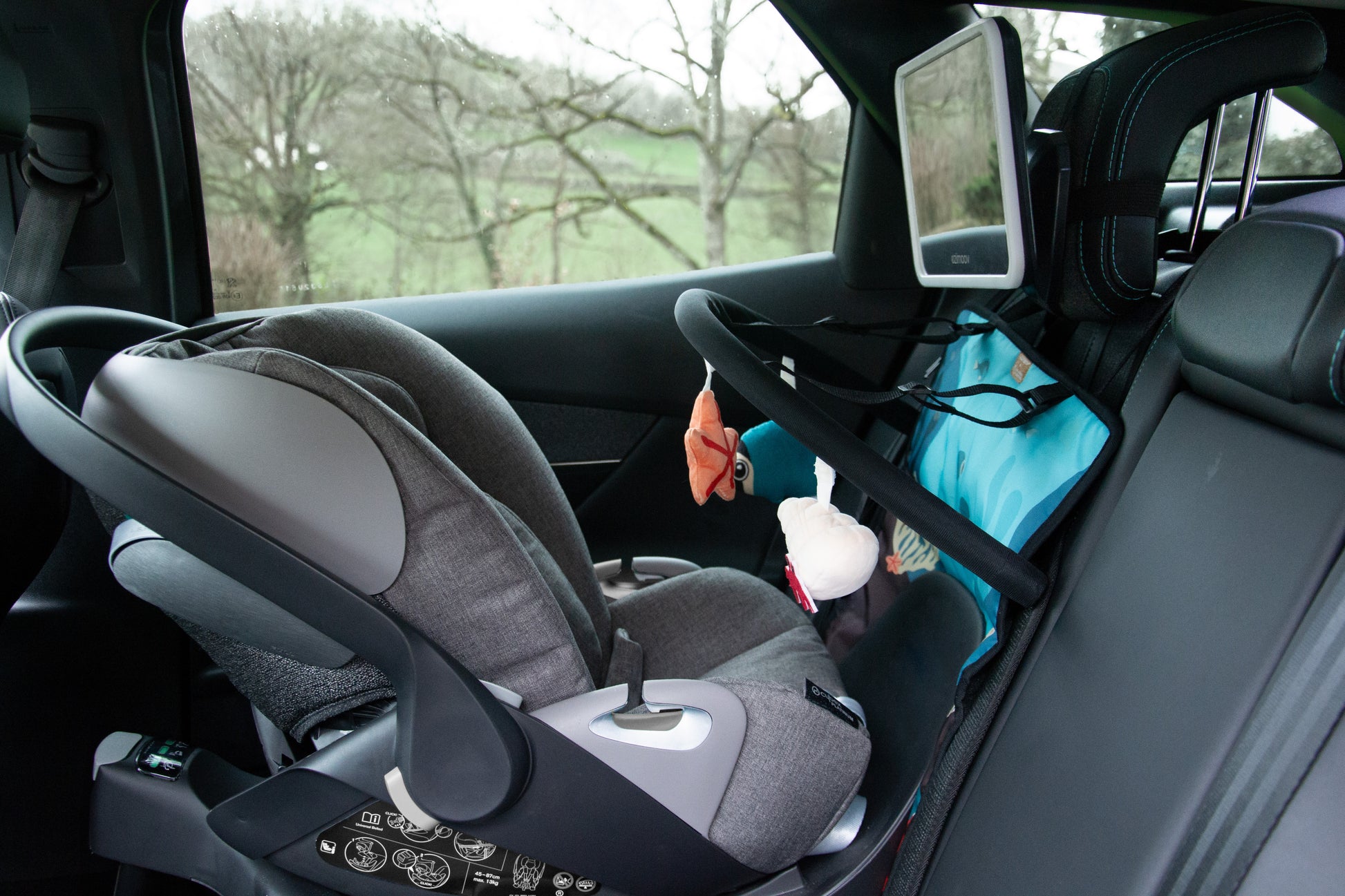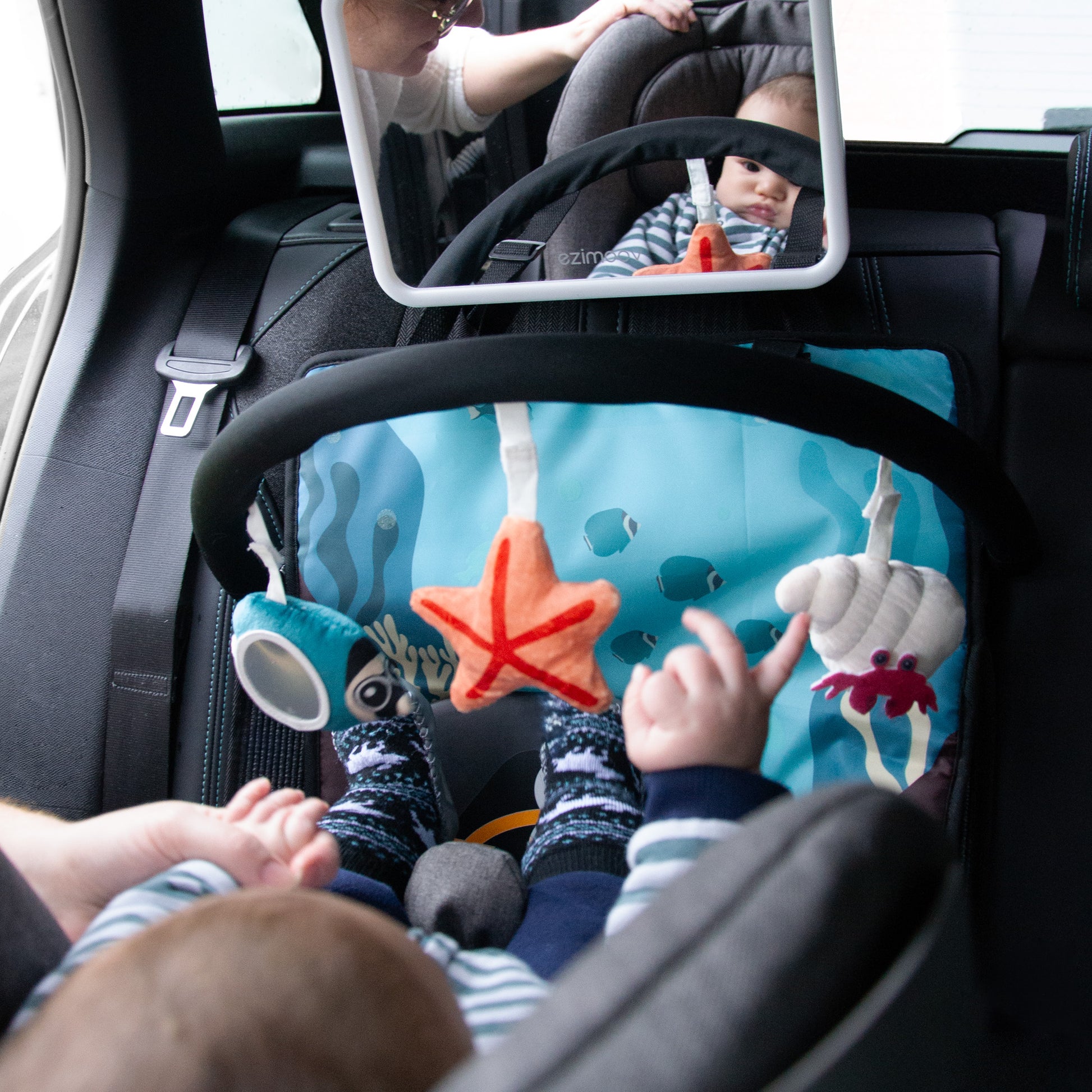Hátrafelé néző autósülésekhez tervezve: Ideális a baba látóterének bővítésére, miközben kényelmesen eléri és szemlélheti az elemeket.