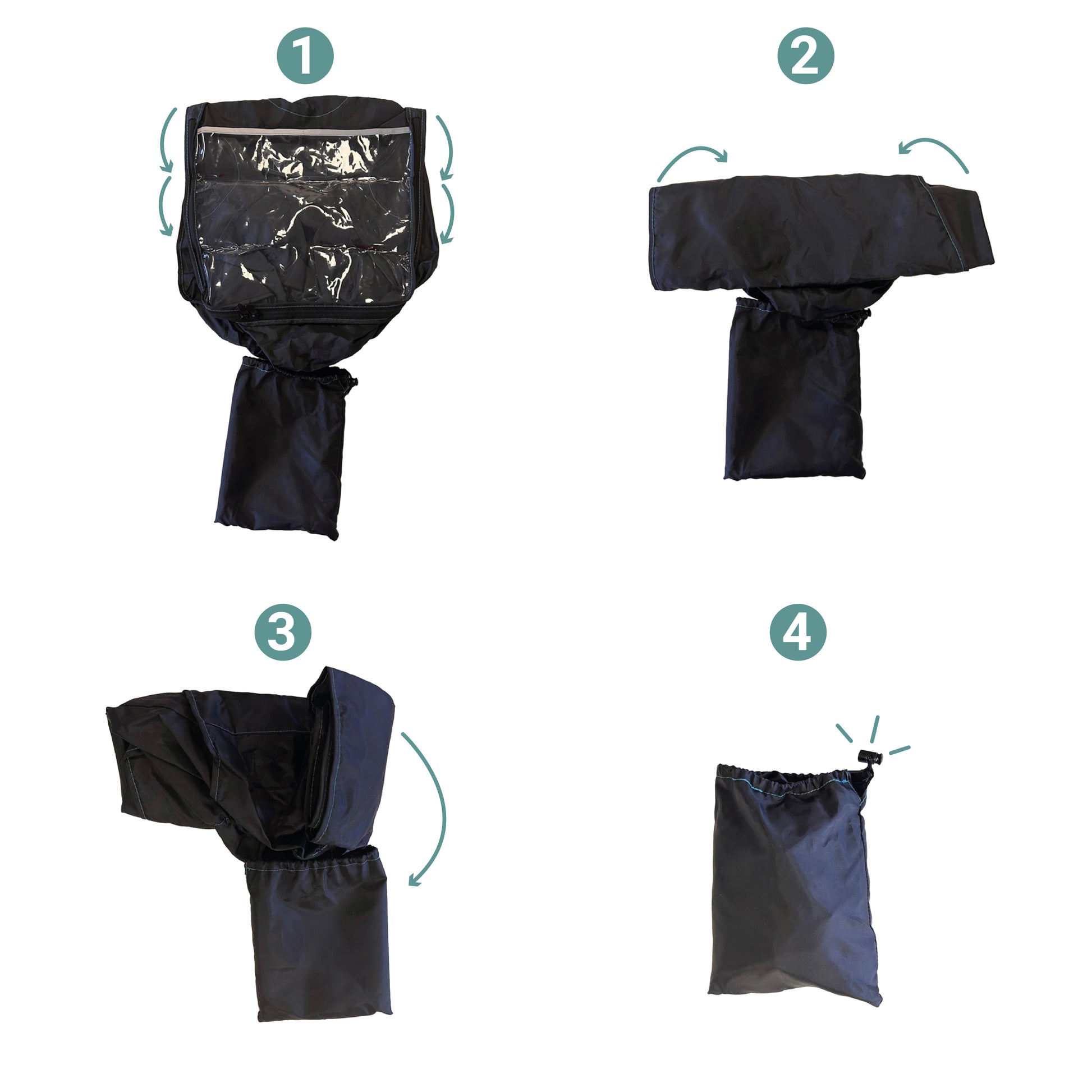 A praktikus beépített tárolózseb lehetővé teszi, hogy használaton kívül egyszerűen tárolja az esővédőt, így könnyen hozzáférhető, amikor szükség van rá. Az esővédő 60%-ban újrahasznosított műanyagból készült, így környezetbarát, miközben tartós és hatékony megoldást nyújt a baba védelmére utazás közben.